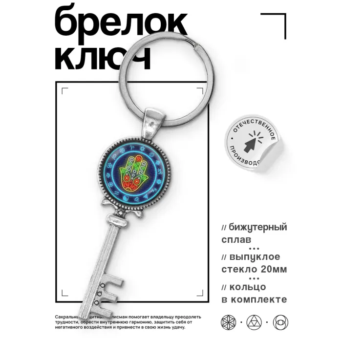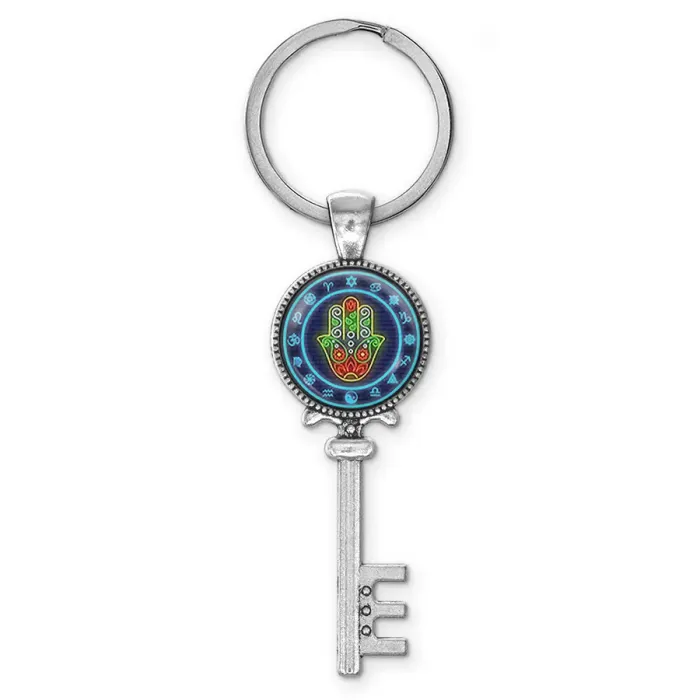 Брелок для ключей из бижутерного сплава в форме символа Хамса с изображением под стеклянной линзой.