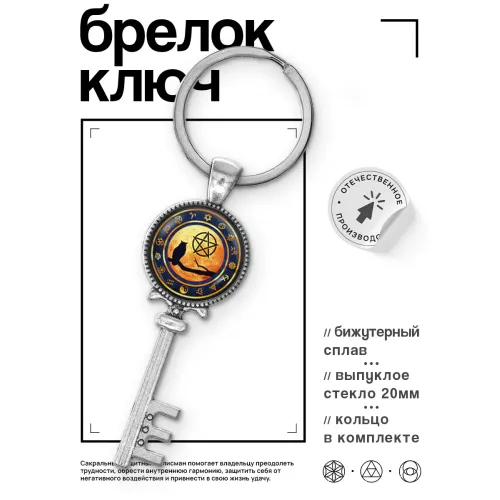 Брелок в виде ключа с изображением совы и пентаграммы. Изделие из бижутерного сплава с покрытием под серебро.