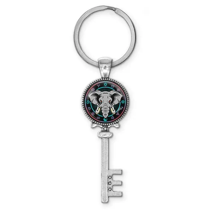 Брелок для ключей из бижутерного сплава с изображением слона под выпуклой стеклянной линзой.