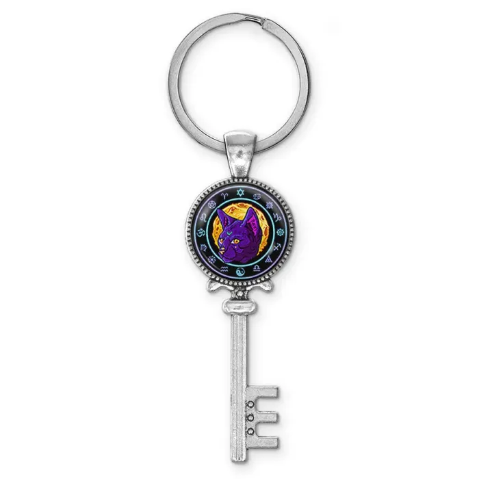 Брелок для ключей из бижутерного сплава с изображением лунного кота под выпуклой стеклянной линзой.