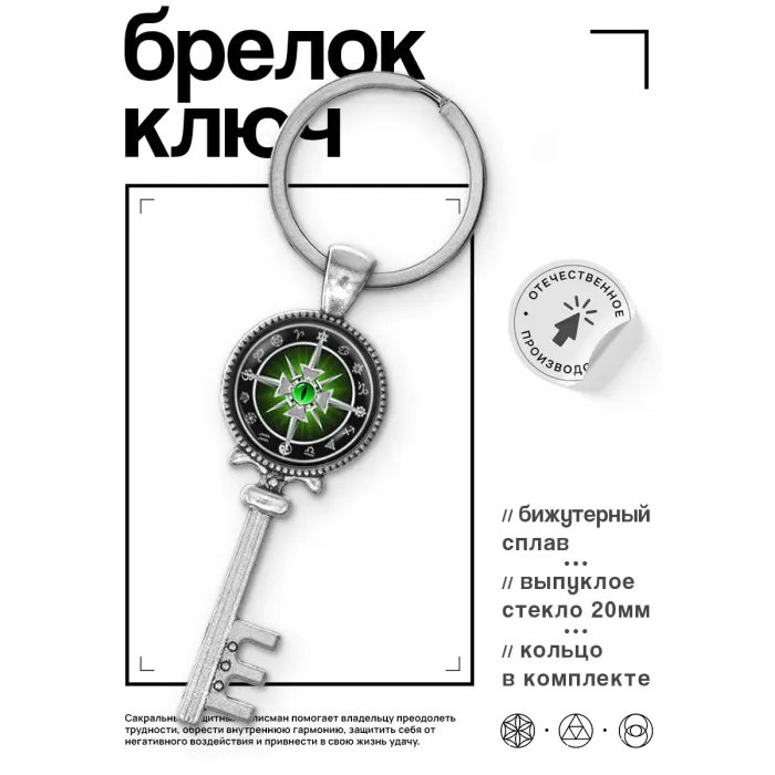 Брелок в виде ключа-креста с изображением глаза и клинков. Изготовлен из бижутерного сплава.
