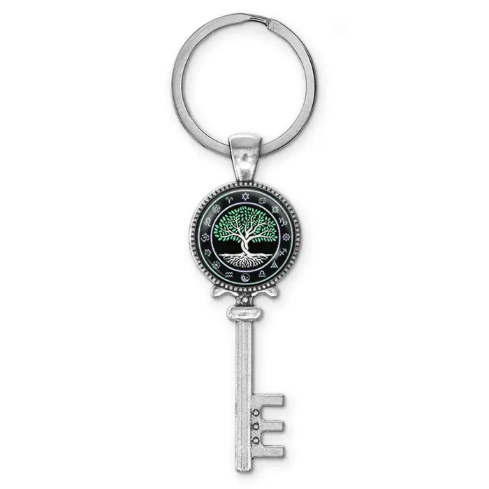 Брелок для ключей из бижутерного сплава с изображением двух деревьев под выпуклой стеклянной линзой.
