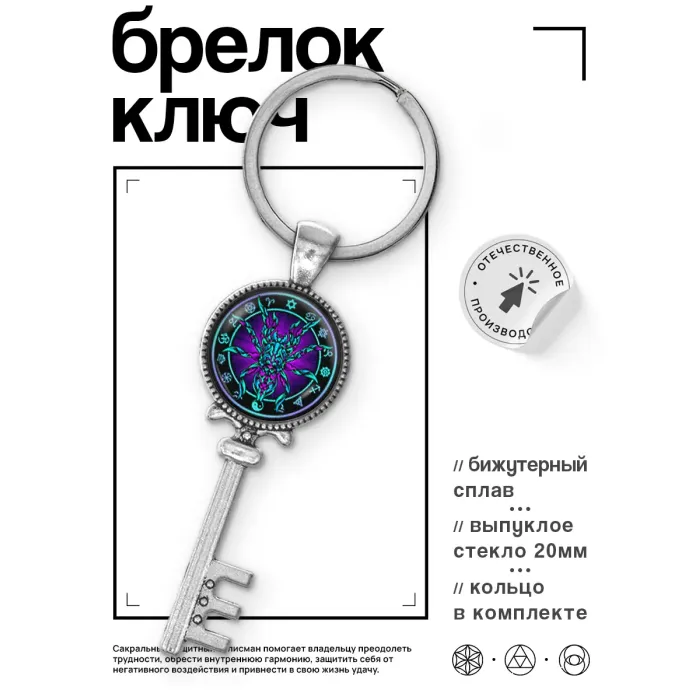 Размеры и комплектация: Размер 60х20 мм (без кольца), диаметр изображения 18 мм. В комплекте кольцо для ключей. Упаковка — прозрачный пакет.