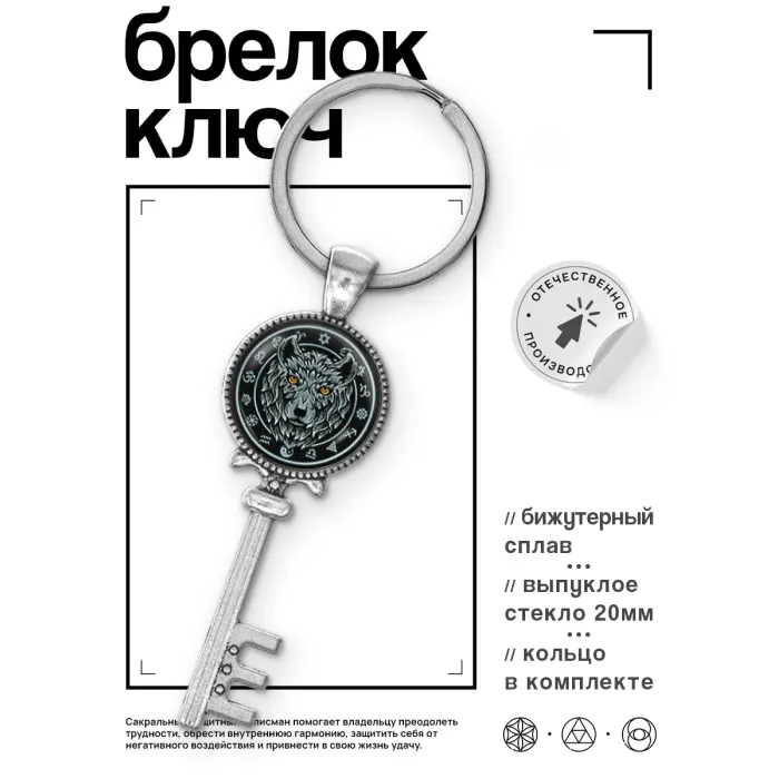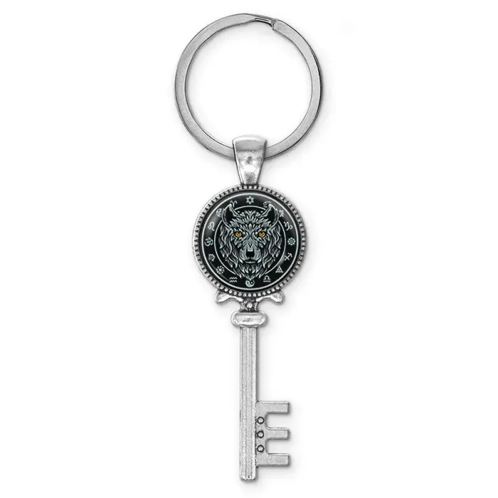 Брелок для ключей из бижутерного сплава с изображением волка под выпуклой стеклянной линзой.
