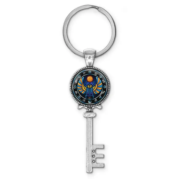 Брелок для ключей из бижутерного сплава с изображением крылатого скарабея под стеклянной линзой.