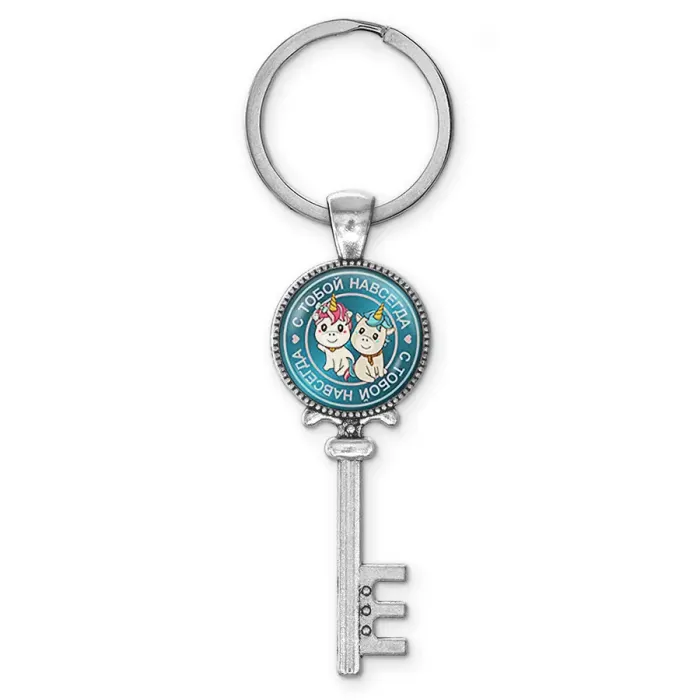 Брелок для ключей из бижутерного сплава с покрытием под серебро и изображением под выпуклой стеклянной линзой.