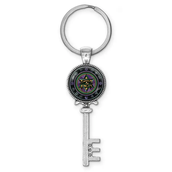 Брелок для ключей из бижутерного сплава с покрытием под серебро и изображением Ока Гора под стеклянной линзой.