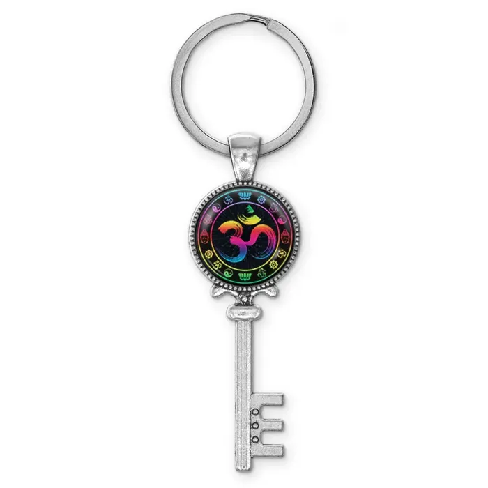 Брелок для ключей из бижутерного сплава с изображением символа Ом под выпуклой стеклянной линзой.