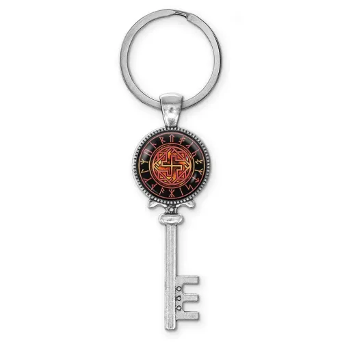 Брелок для ключей из бижутерного сплава с покрытием под серебро и изображением валькирии под стеклянной линзой.