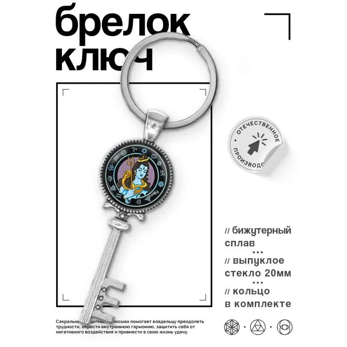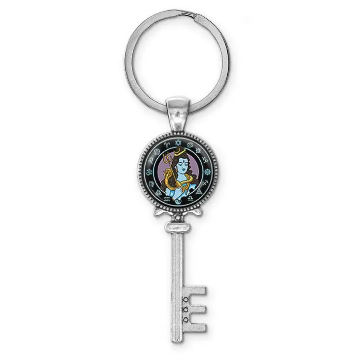 Брелок для ключей из бижутерного сплава с изображением Шивы под стеклянной линзой.