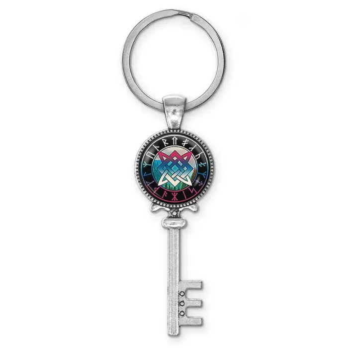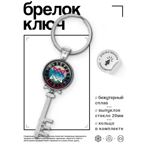 Брелок для ключей из бижутерного сплава с изображением Звезды Руси под стеклянной линзой.