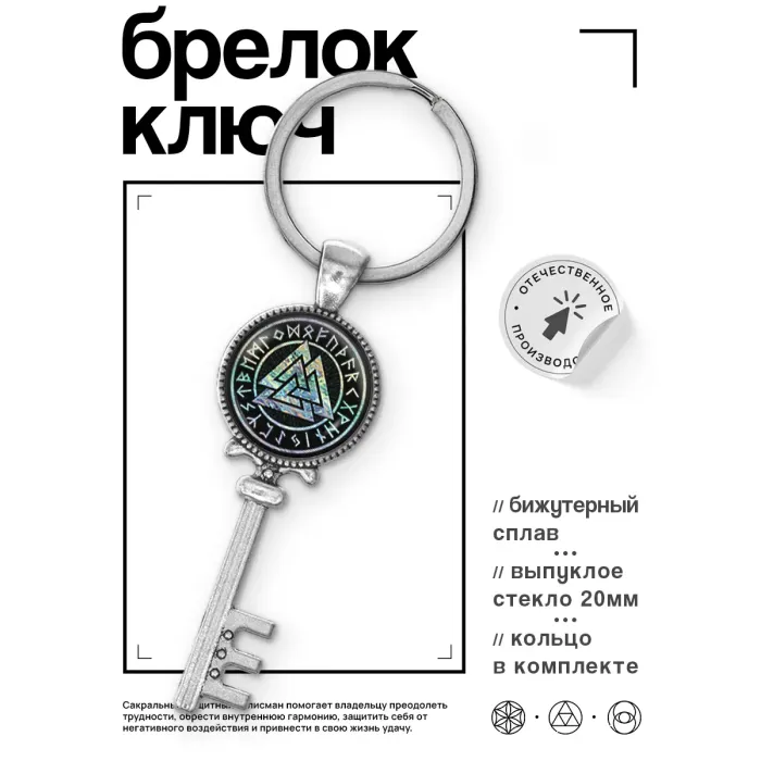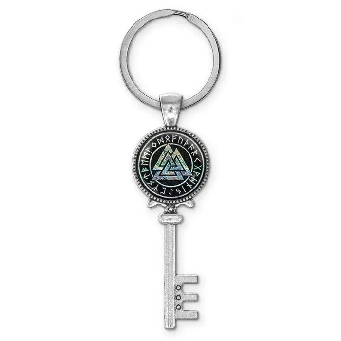 Брелок для ключей из бижутерного сплава с символом Валькнута под стеклянной линзой.