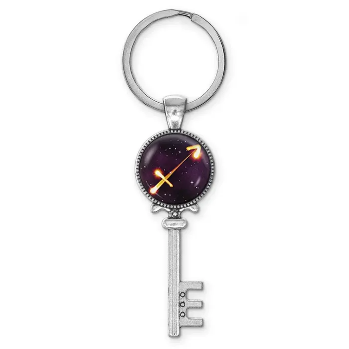 Брелок для ключей из бижутерного сплава с изображением знака зодиака Стрелец под выпуклой стеклянной линзой.