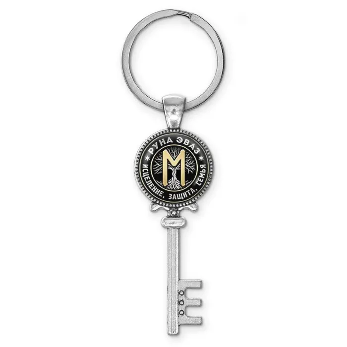 Брелок для ключей из бижутерного сплава с изображением руны Эваз под выпуклой стеклянной линзой.