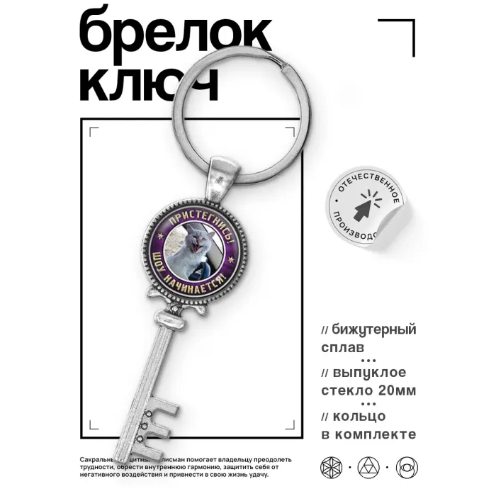 Брелок для ключей из бижутерного сплава с покрытием под серебро и изображением под выпуклой стеклянной линзой.