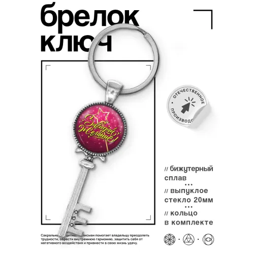 Брелок для ключей из бижутерного сплава с покрытием под серебро и изображением под выпуклой стеклянной линзой.