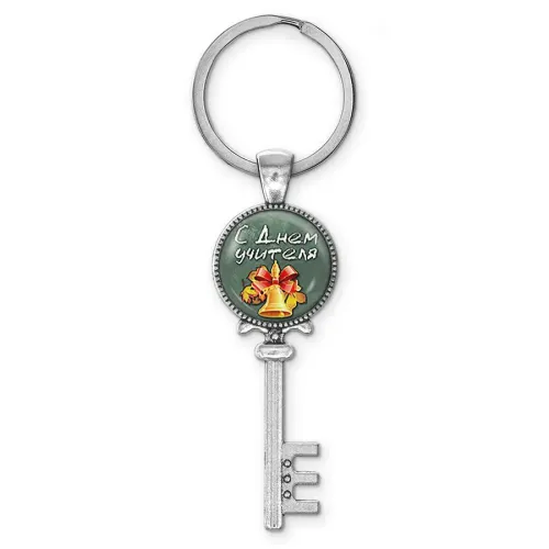 Брелок-ключ сувенирный ко Дню учителя из бижутерного сплава с покрытием под серебро и изображением под стеклянной линзой.