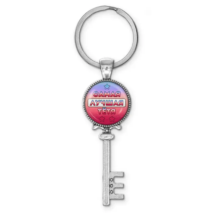Брелок для ключей «Ключ Самая лучшая тётя» из бижутерного сплава с изображением под стеклянной линзой.