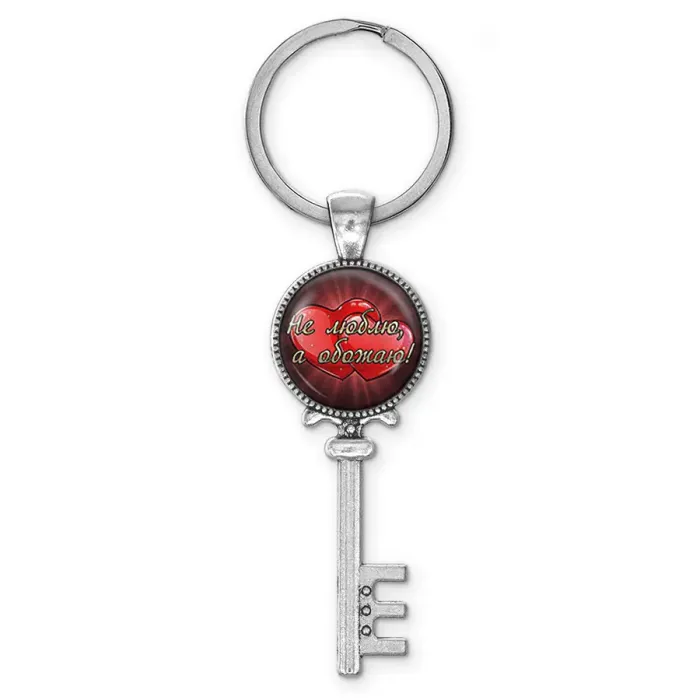 Брелок-ключ из бижутерного сплава с изображением под выпуклой стеклянной линзой.