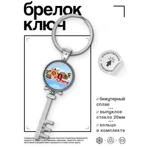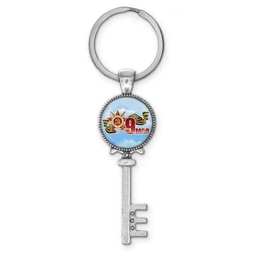 Брелок в виде ключа из бижутерного сплава с тематическим изображением ко Дню Победы. Изображение защищено выпуклой стеклянной линзой.
