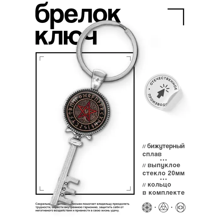 Брелок для ключей из бижутерного сплава с символами пентаграммы и дерева жизни.