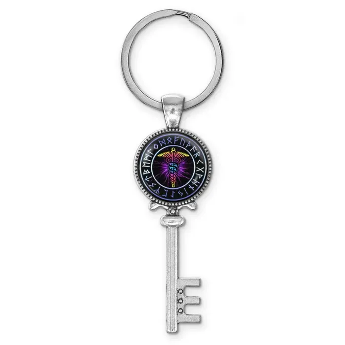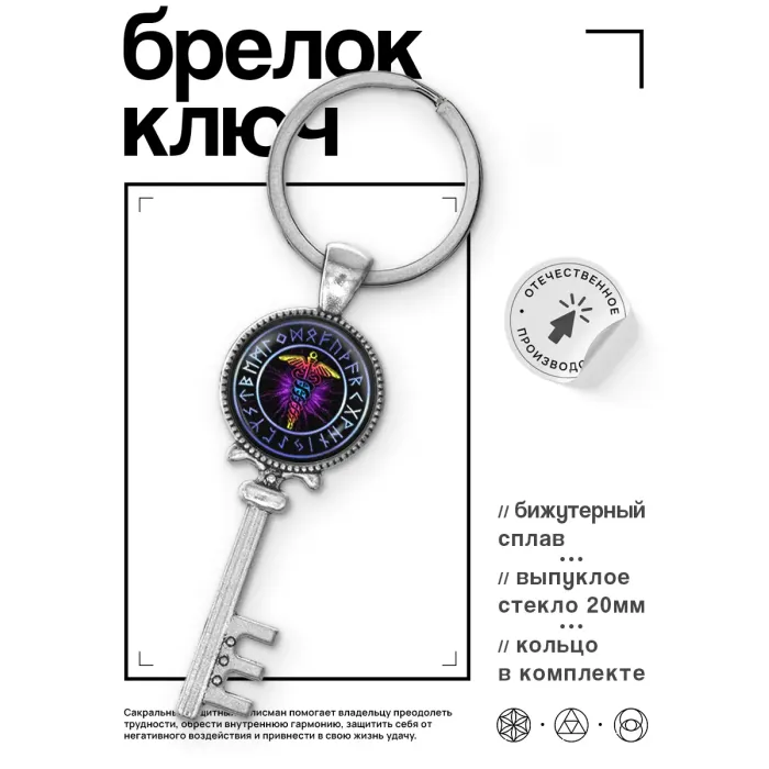 Брелок в виде ключа с символом кадуцея. Изготовлен из бижутерного сплава с покрытием под серебро, изображение защищено выпуклой стеклянной линзой.