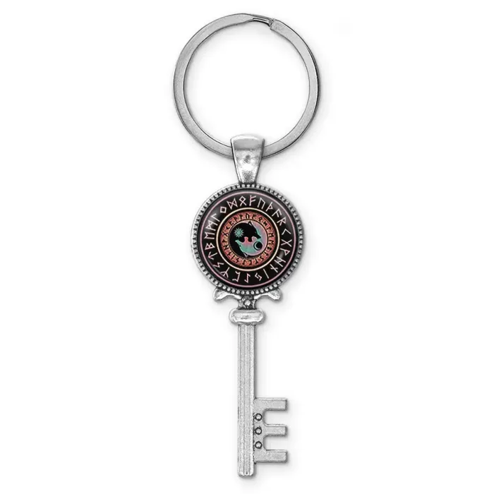 Брелок для ключей из бижутерного сплава с дизайном «Волки Инь-Ян» под стеклянной линзой.