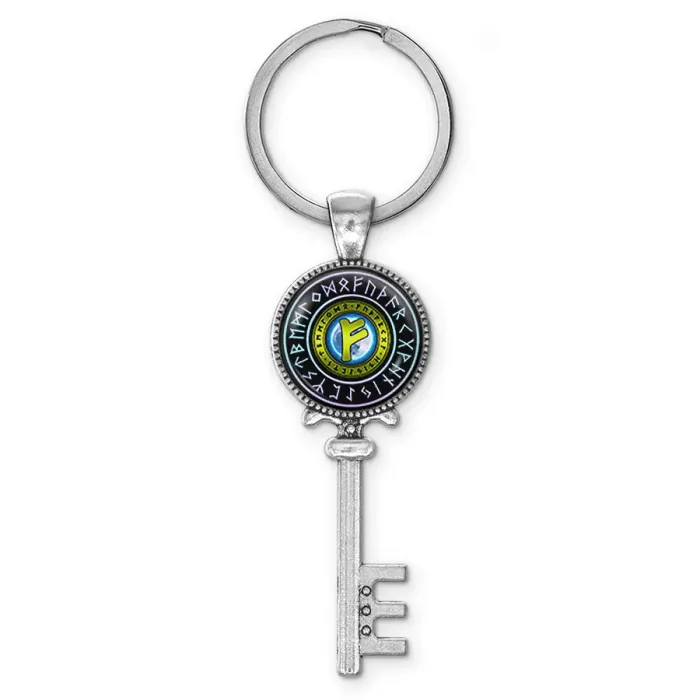 Брелок для ключей из бижутерного сплава с изображением руны Феху под стеклянной линзой.