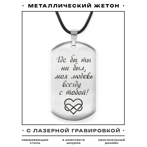 Жетон на шнурке для ношения. Изготовлен из полированной нержавеющей стали с лазерной гравировкой изображения на одной стороне.