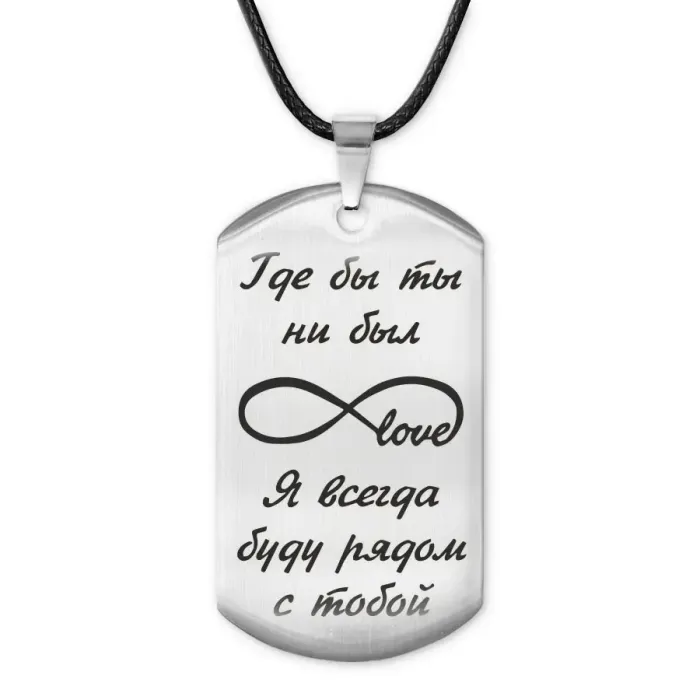 Жетон на шнурке из полированной нержавеющей стали с лазерной гравировкой на одной стороне.