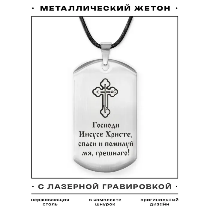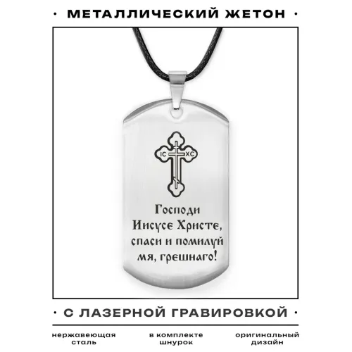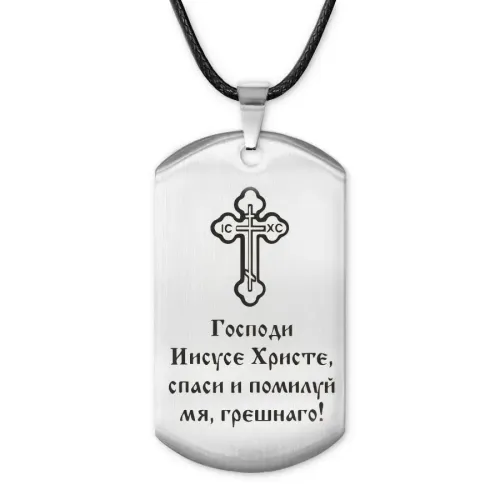 Жетон на шнурке с надписью «Спаси и помилуй». Изготовлен из полированной нержавеющей стали.