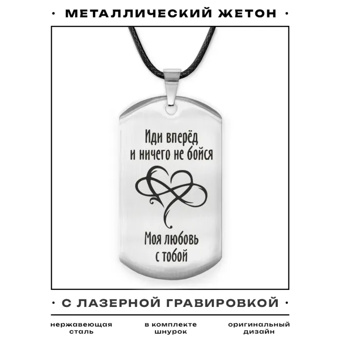 Размеры и комплектация: Размер жетона 50х28 мм. В комплекте шнурок с застёжкой. Упаковка — прозрачный пакет.