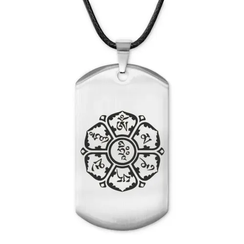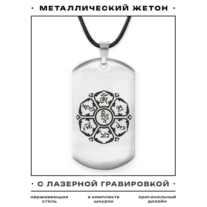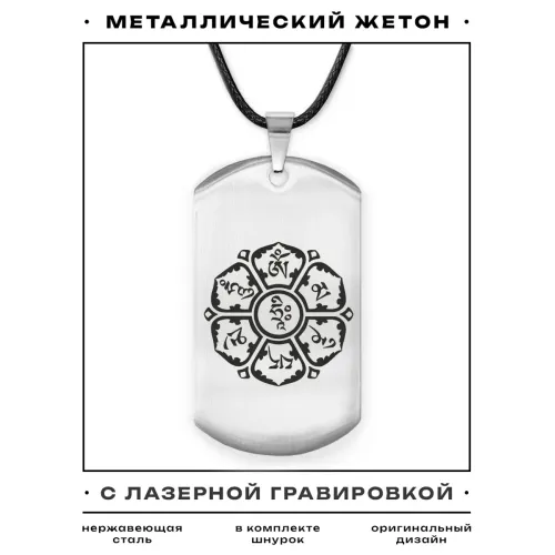Амулет-жетон с буддийской мантрой, выполненный из нержавеющей стали с зеркальной полировкой и лазерной гравировкой.