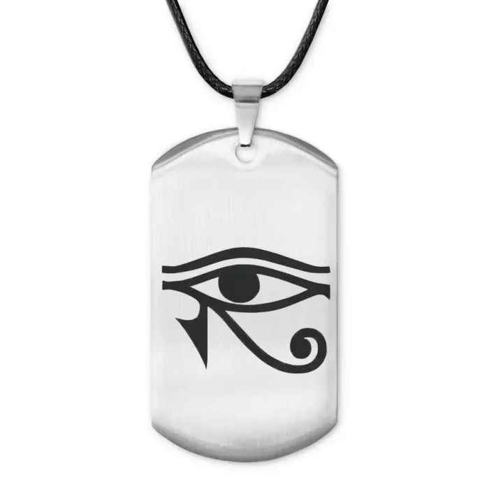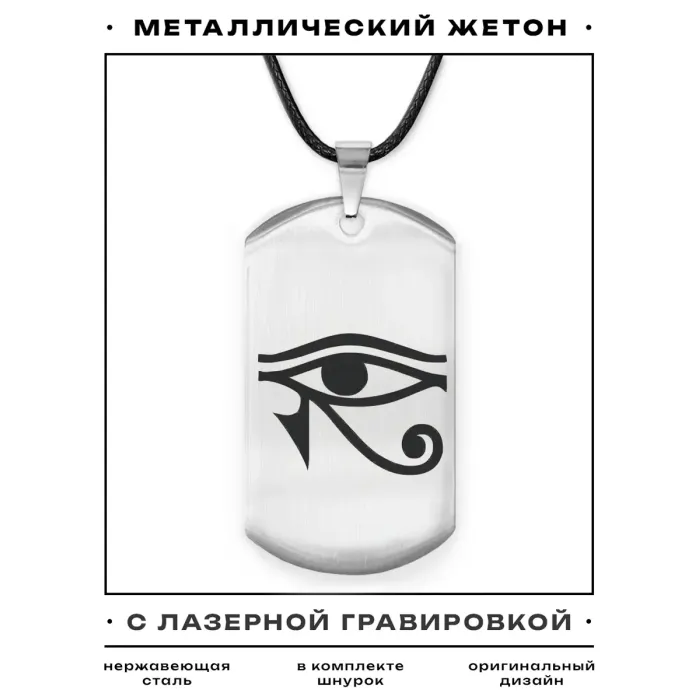 Амулет-жетон с изображением Ока Ра, выполненный из нержавеющей стали с зеркальной полировкой. Дизайн нанесён методом лазерной гравировки.