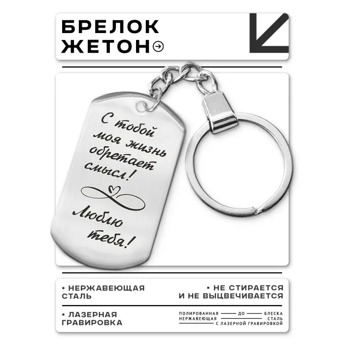 Брелок-жетон из нержавеющей стали с лазерной гравировкой на одной стороне.