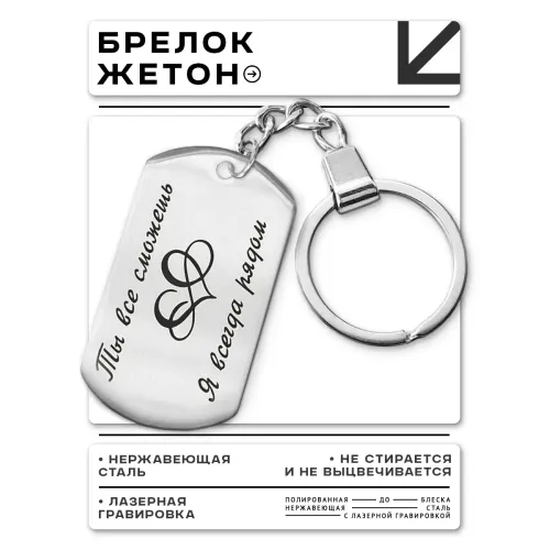 Брелок-жетон из полированной нержавеющей стали с лазерной гравировкой на одной стороне.