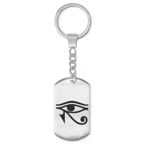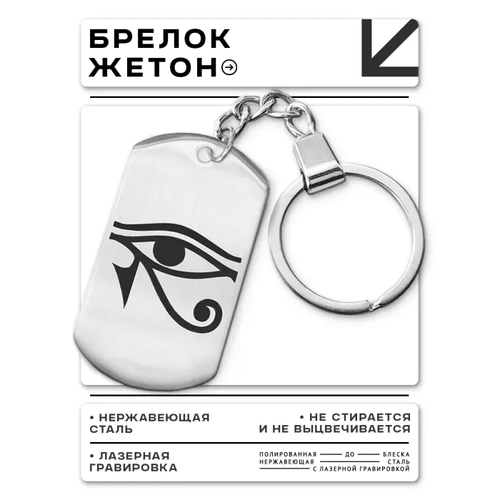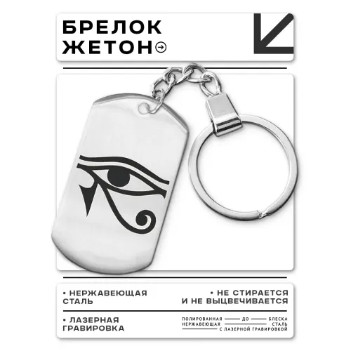 Брелок-жетон из полированной нержавеющей стали с лазерной гравировкой изображения Ока Ра на одной стороне.