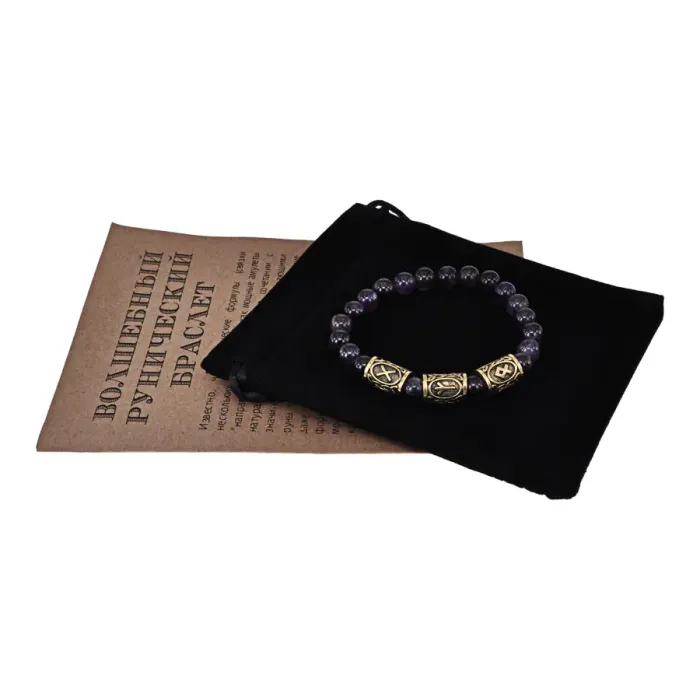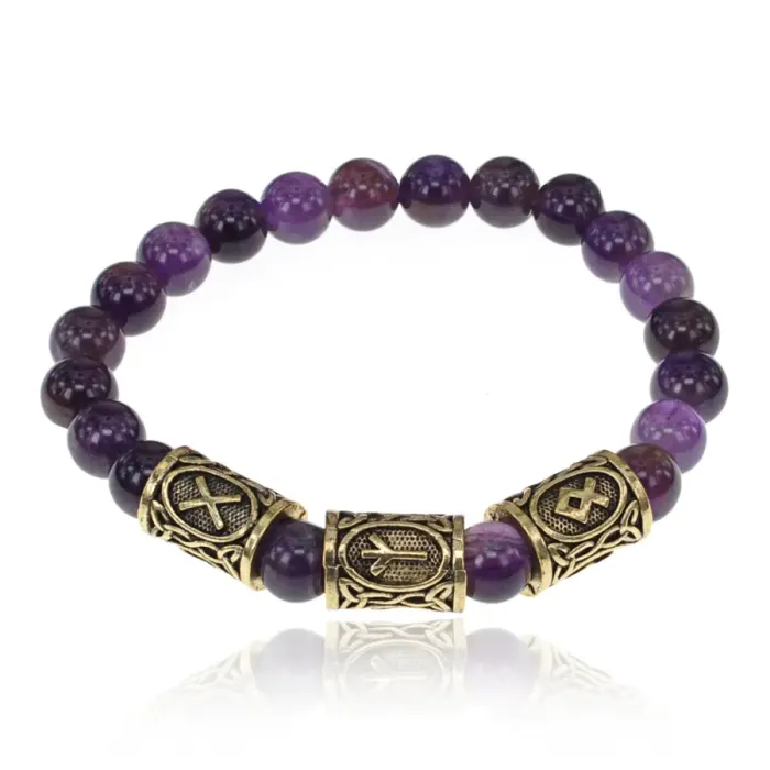 Браслет с рунами под золото Примирение Успокоение Согласие, с нат. камнем Аметист 8мм BSRZ028