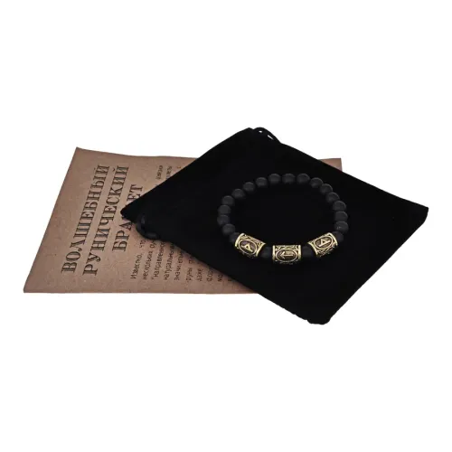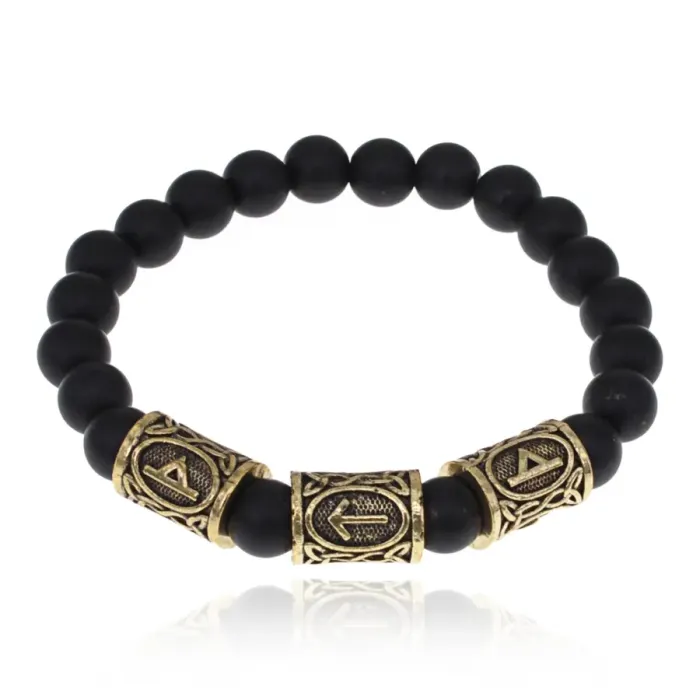 Браслет с рунами под золото Защитный барьер, с синт. камнем Шунгит 8мм BSRZ036