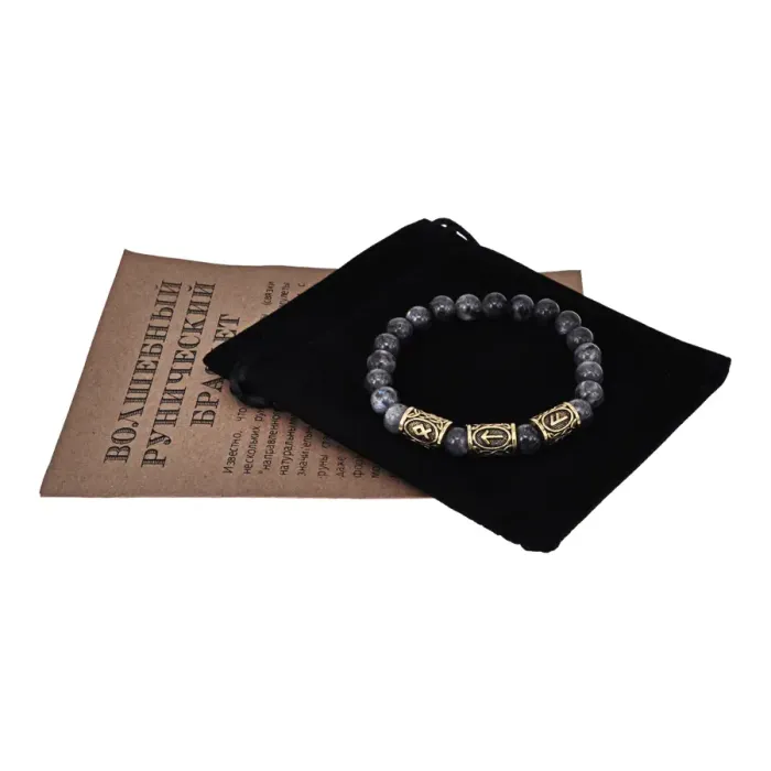 Рунический браслет из натурального камня лабрадор и бижутерного сплава с покрытием под золото.