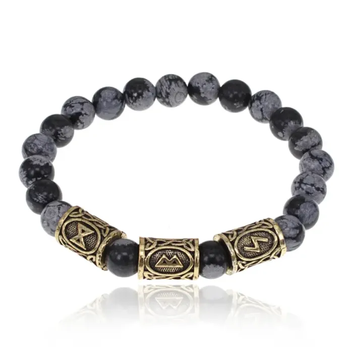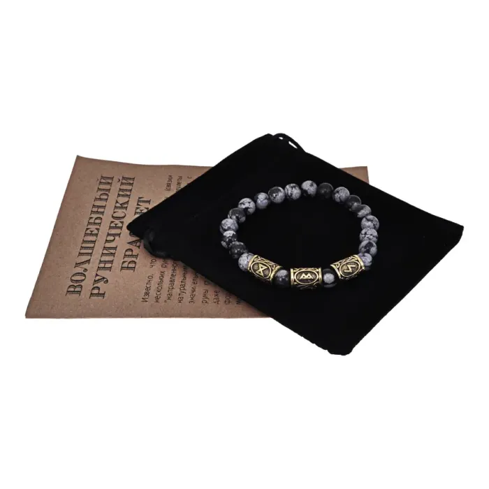 Браслет с рунами под золото Обновление и духовное очищение, с нат. камнем Обсидиан 8мм BSRZ038