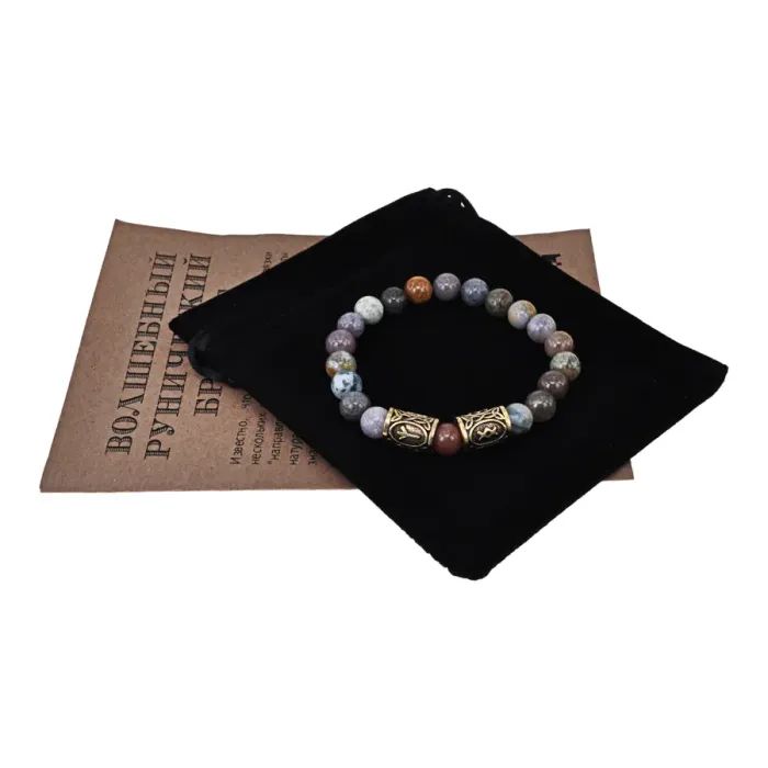 Размеры и комплектация: Внутренний диаметр около 5.5 см. В набор входят браслет, бархатный мешочек для хранения и буклет с описанием значений рун и свойств камня.