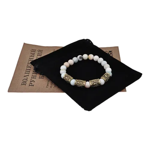Стрейч-браслет с натуральным камнем амазонит и бусинами из бижутерного сплава с покрытием под золото, украшенный руническими символами.