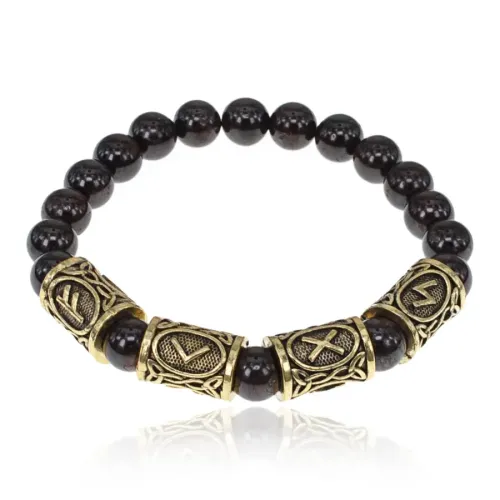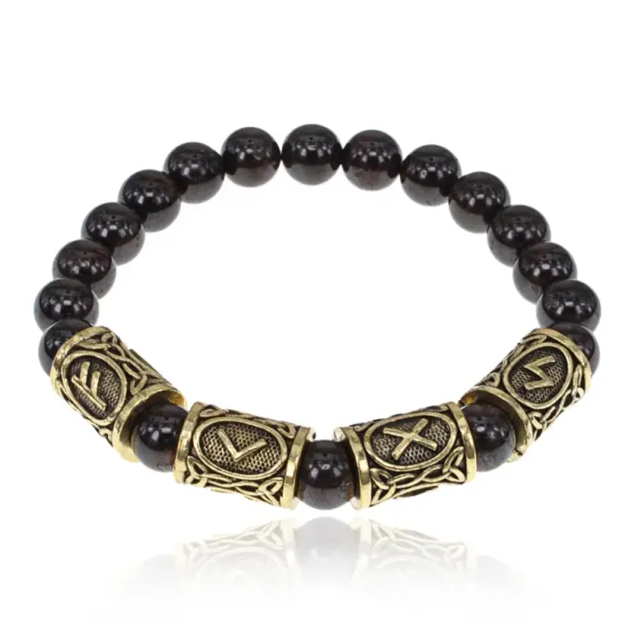 Браслет с рунами под золото Успешная реализация идей, с нат. камнем Гранат 8мм BSRZ052