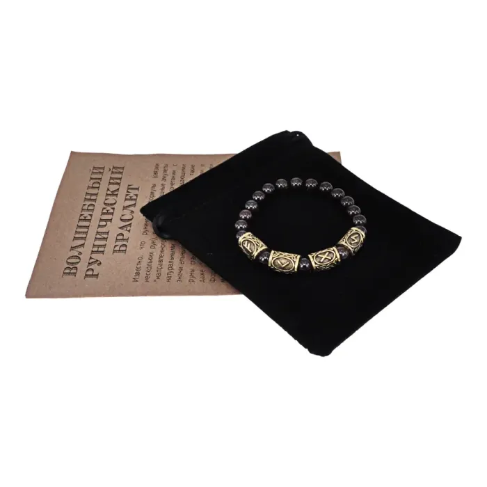 Размеры и комплектация: Внутренний диаметр около 5,5 см. В комплекте черный бархатный мешочек и буклет с описанием рун и свойств камней.