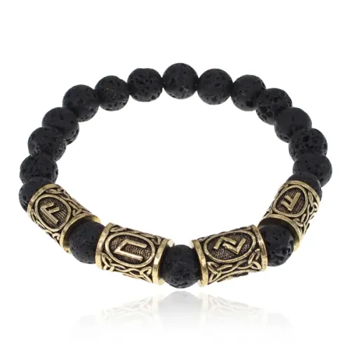 Браслет с рунами под золото Счастье, Удача, Успех, с нат. камнем Лава 8мм BSRZ057