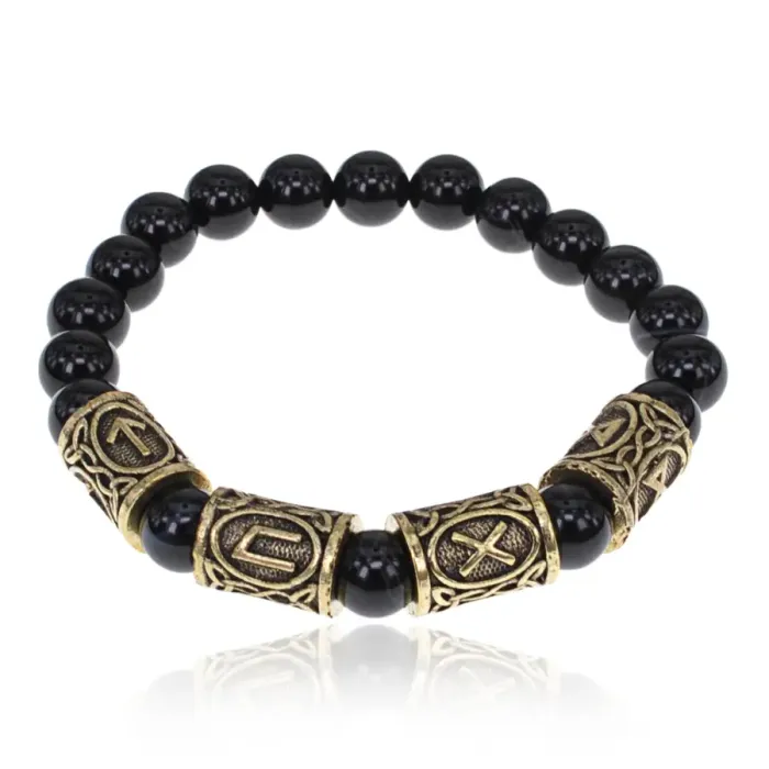 Браслет для ношения с руническими символами. Изготовлен из натурального чёрного агата и бижутерного сплава с покрытием под золото.