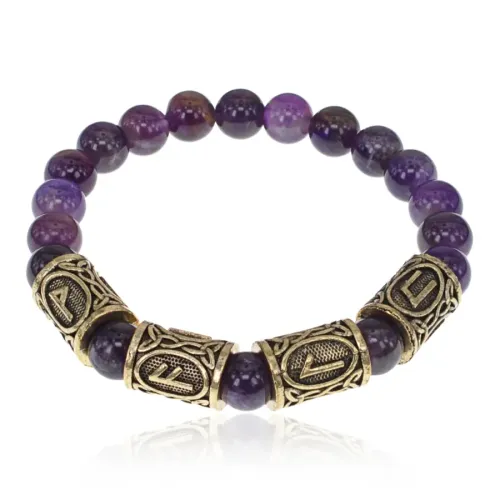 Браслет с рунами под золото Гармонизация внутреннего мира, с нат. камнем Аметист 8мм BSRZ062