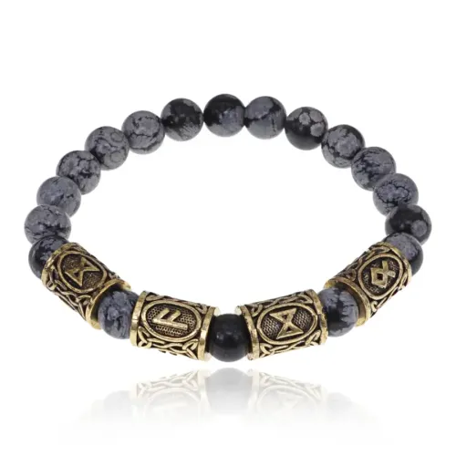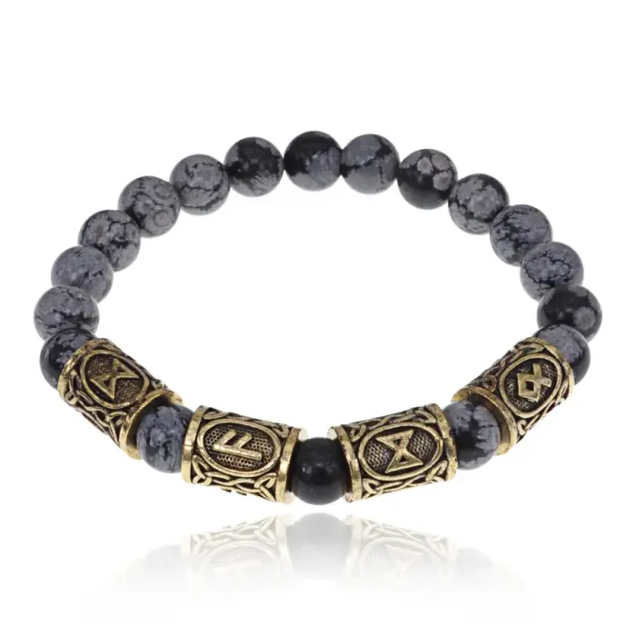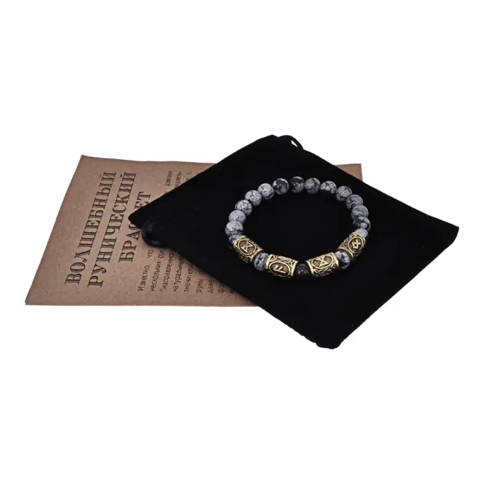 Браслет с рунами под золото Поддержка богов и предков, с нат. камнем Обсидиан 8мм BSRZ066