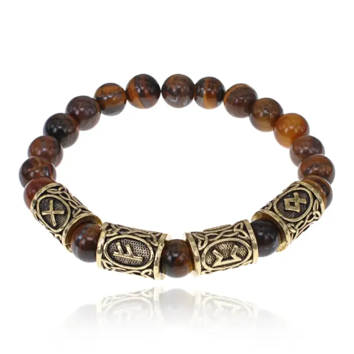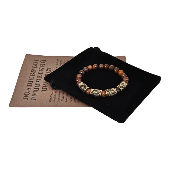 Стрейч-браслет с руническими символами и натуральным камнем. Изготовлен из бижутерного сплава с покрытием под золото и бусин тигрового глаза.